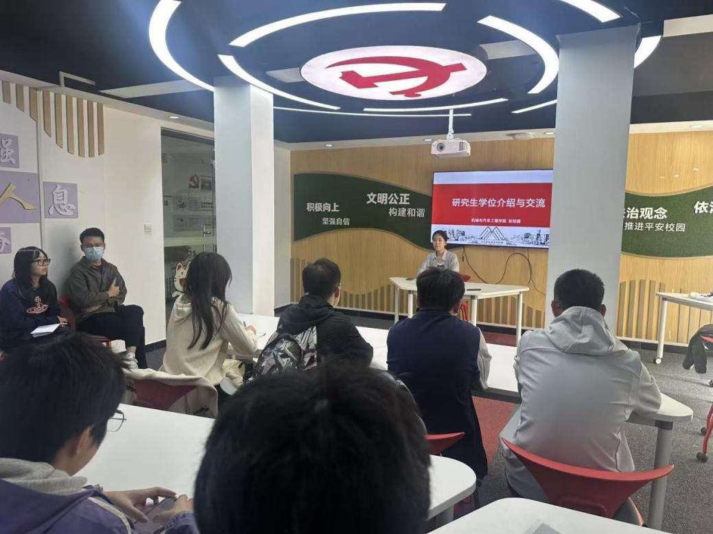 10月28日,2138cn太阳集团古天乐在一站式学生社区服务中心举办研究生“驻楼导师工作站”系列活动——“研究生学位介绍与交流”和“研究生培养工作指导与交流”。活动邀请学院研究生秘书张柏薇、蔡晓琳做主题分享。学院学工组长董春亮主持。